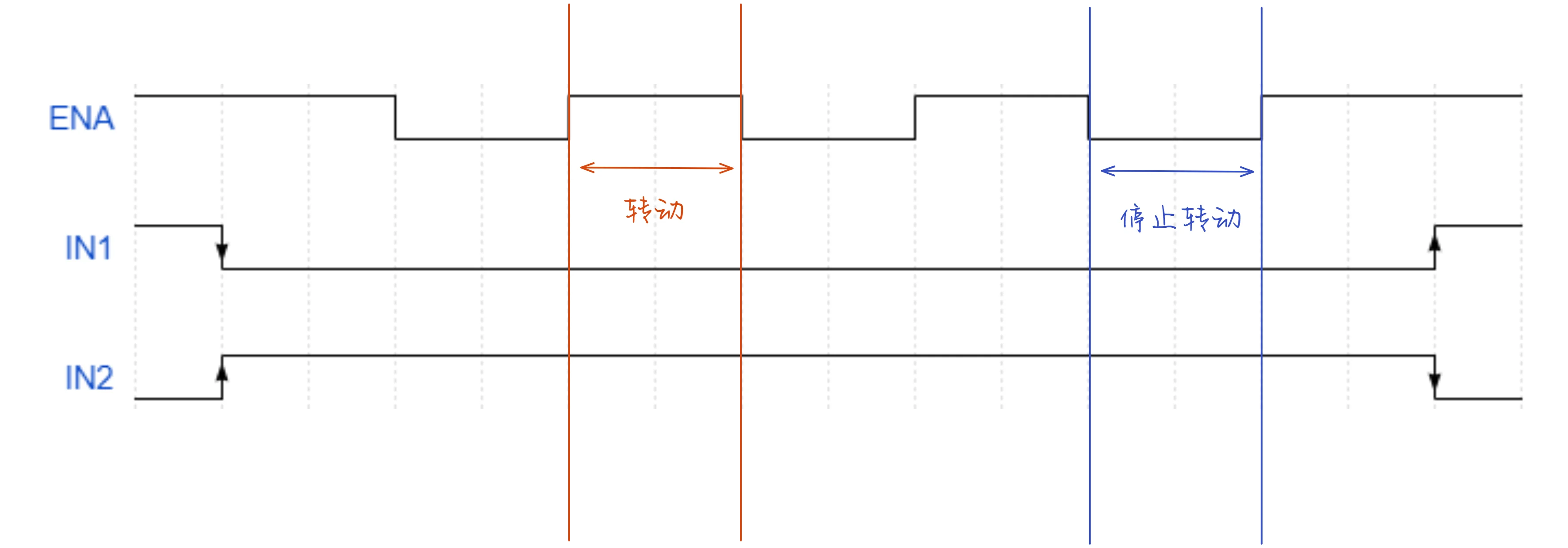 三个控制引脚的电机驱动是在 IN1、IN2 控制脚的基础上,增加了一个控制 IN1 和 IN2 通断的管脚 ENA(如下图)。