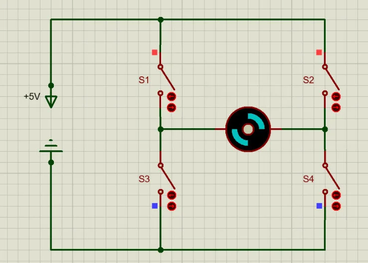 在上图中,四个开关和电机构成了一个驱动电路,因为形状像字母“H”,所以称作 H桥驱动。
