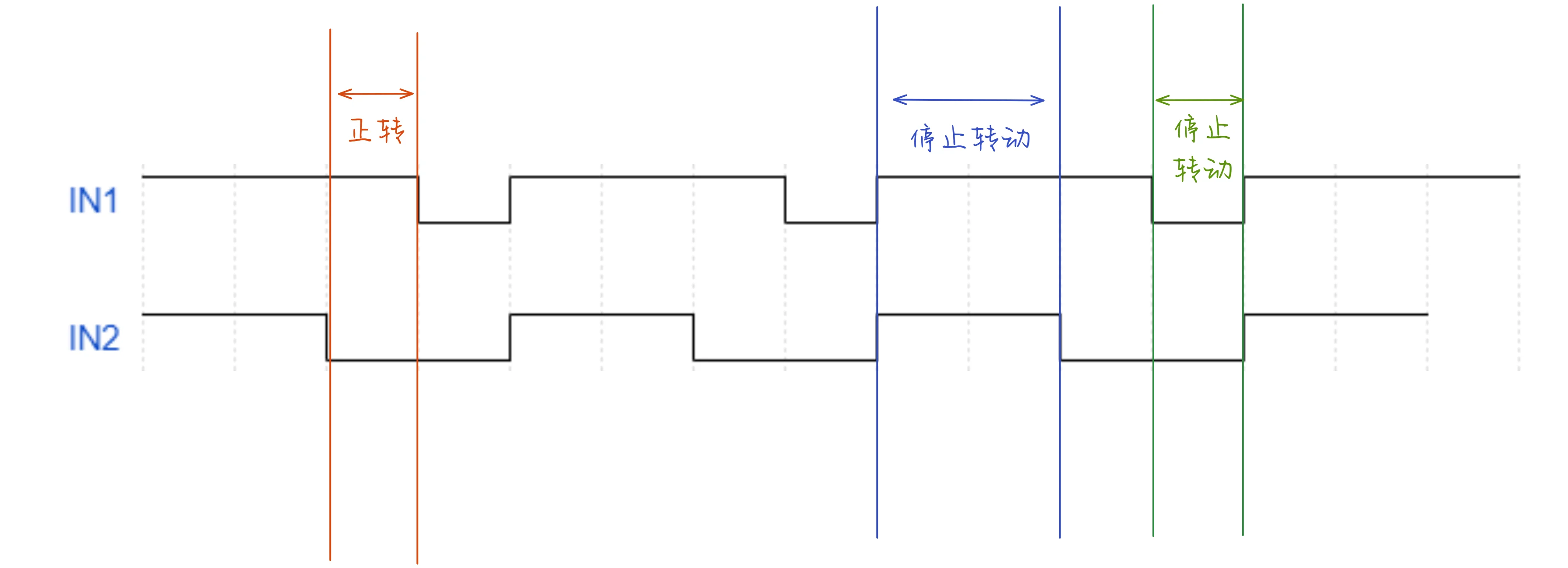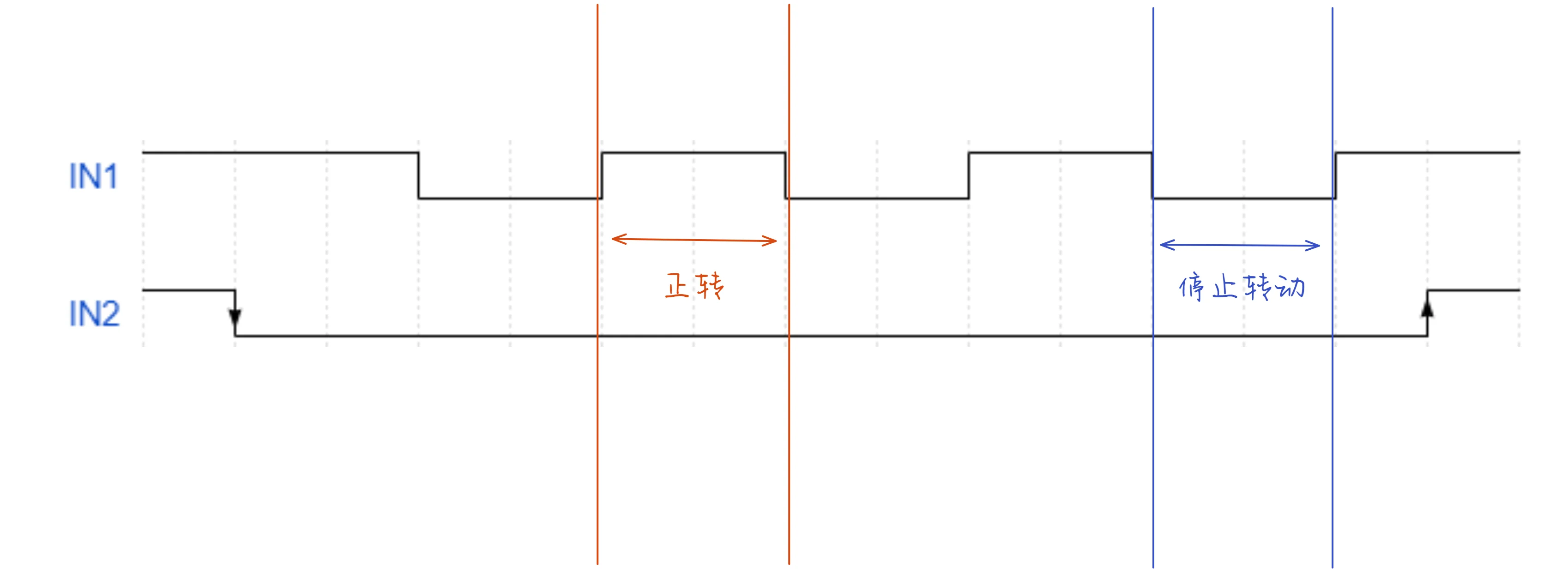 PWM1 占空比>PWM2 占空比(如上图)- 电机正转