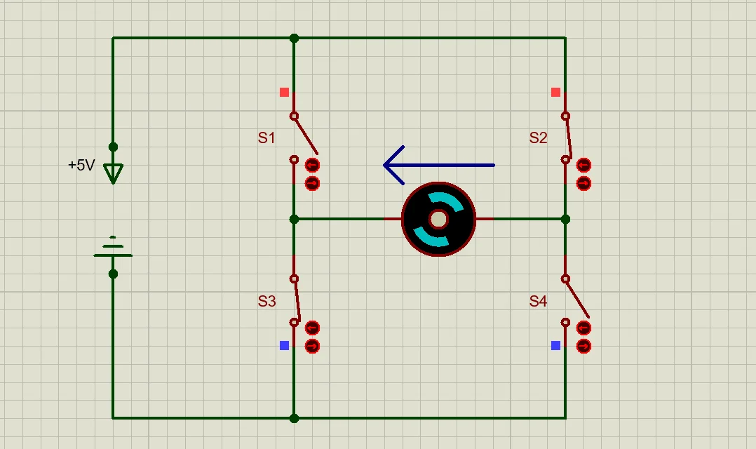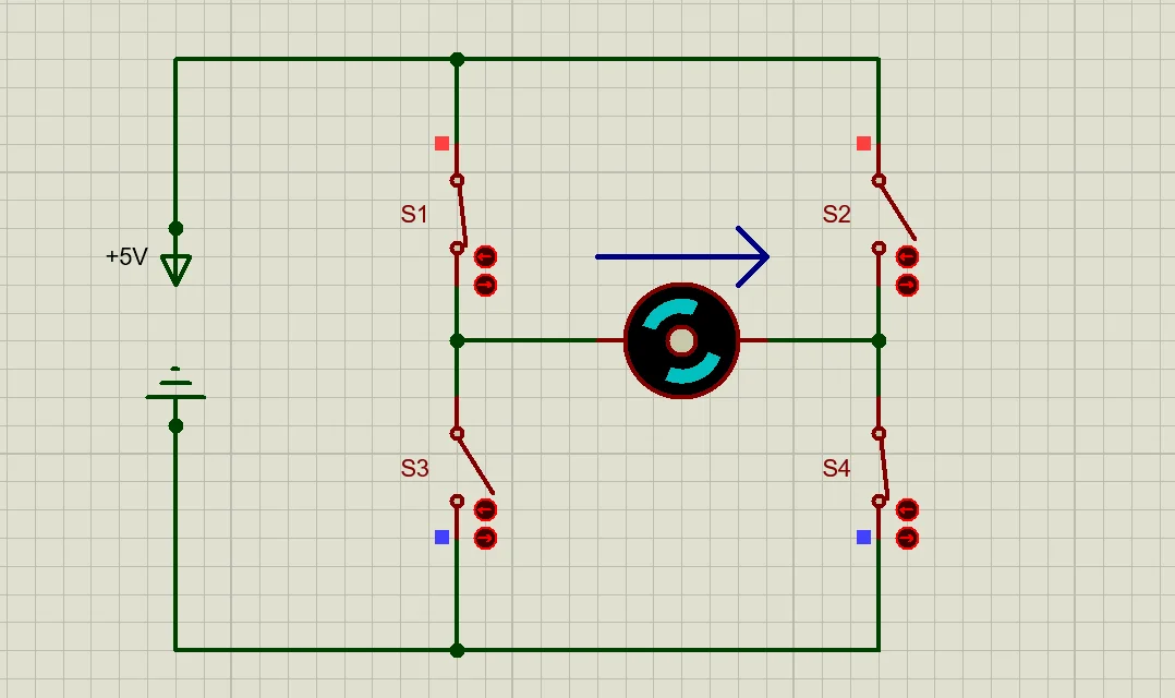 2.2.1 如上图,闭合开关 S1 和 S4,电机两端的电压方向为从左到右,电机正转