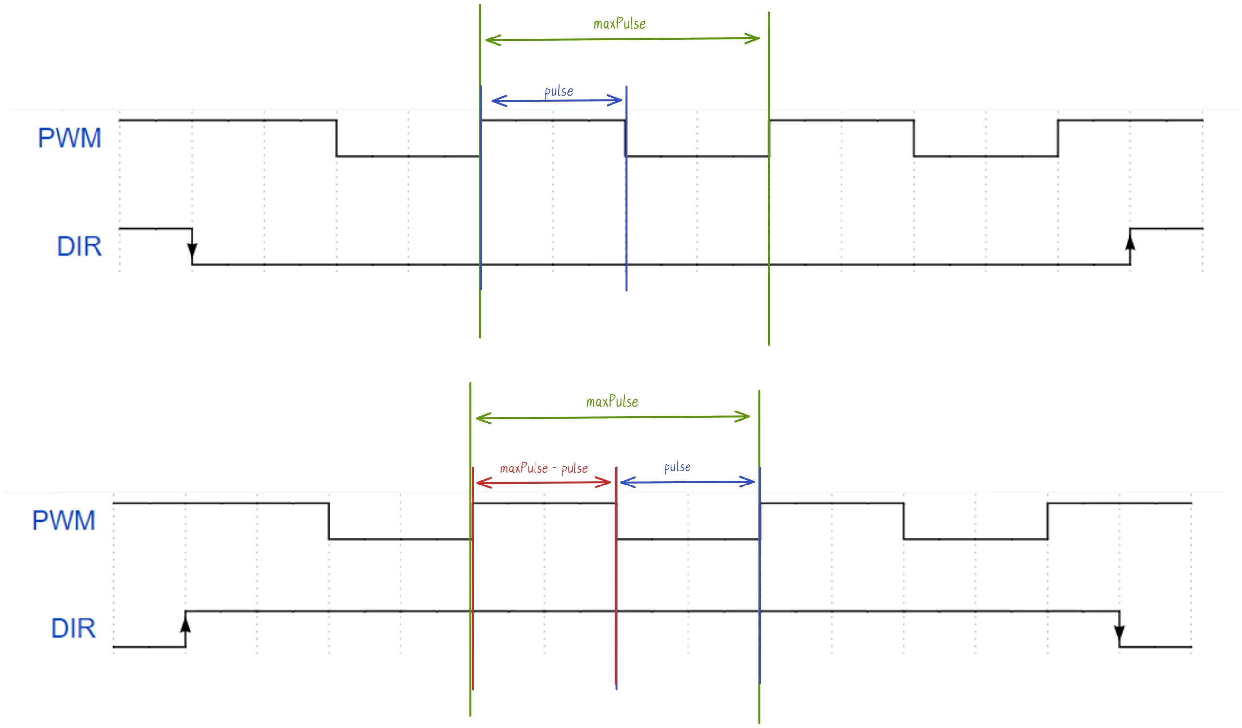 duty=pulse/maxPulse - 当 DIR = 1 时,电机反转,电机的转速取决于反向占空比,此时